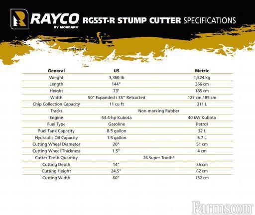 Email:chyskell@agproco.com This does not include material surcharges or freight. Rayco RG55R Stump Grinder All Base Cash Price. Features: • Kubota 55-HP, liquid-cooled gasoline engine with 89 lb-ft of peak torque • Non-marking tracks (white tracks) with 2 Speed Ground Travel • Electric clutch with integrated cutter wheel brake • Wireless radio remote controls in addition to swing-out panel • 2-Wheel front end with hydraulic steering • 20" diameter x 1.5" thick cutter wheel • Financing and delivery available. We offer financing, delivery, and trade-ins are welcome. *PRICE IS SUBJECT TO CHANGE DUE TO AVAILABILITY AND MONTHLY PROMOTIONS. TERRITORY RESTRICTIONS MAY APPLY. CONTACT ME TO ENSURE PRICING.* Corey Hyskell 904*417*3659
