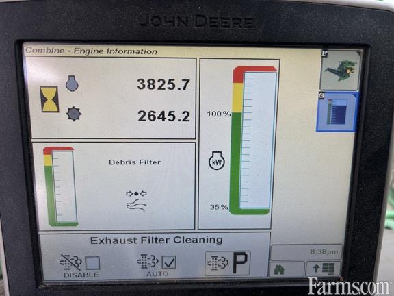 615P 520 DUALS FC ADV PWRCST PWR FLD, Small Grain, 2WD, Singles, Chopper, Yield Monitor, Contour Master (Lateral Tilt Feederhouse), Powercast Tailboard, Power Folding Bin Extension, Header: Yes, Premium Cab with Premium Radio, HID Lighting Package and Header Extremity Lights, AutoTrac Ready with Harvest Monitor, GreenStar 3 2630 Display (mounted on armrest), ProDrive Transmission with Harvest Smart Feedrate Control