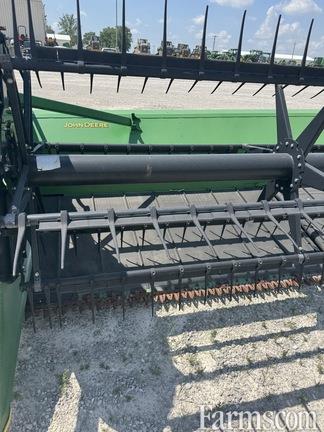 JOHN DEERE 640FD HYDRA-FLEX 40' CENTERED DRAPER PLATFORM, 2015, 7.5" hydra-flex float system, contour master telescopic drive shaft, header height sensing in FLEX mode, dual knife drive, double cut fine tooth sickle, extended wear knife guards, poly tine FLIP OVER pickup reel, hyd fore/aft with resume, dial-a-speed reel control, hydraulic reel drive, 40" wide side draper belts w/speed sensors, single point hyd/electrical hookup, stubble lights, road transport lights, full width poly skid shoes.