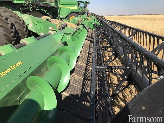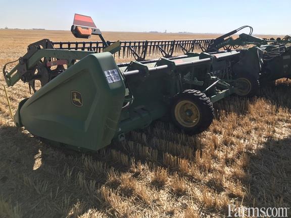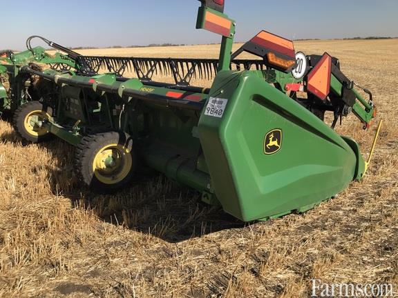John Deere HD45F hinge draper with flexible cutterbar. Fully optioned with integrated transport, extended wear skid shoes, fingered cross auger, wing levelling and grain saver belts.