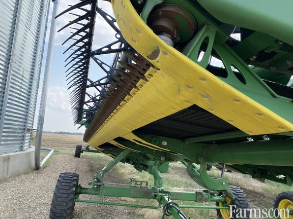 Hinged draper with flex cutterbar, Configured for X9. Fingered Top Auger, Coarse Tooth Knife with Short High Wear Guards, Integrated Transport with Gauge wheels, Grain Saver Draper Belts.