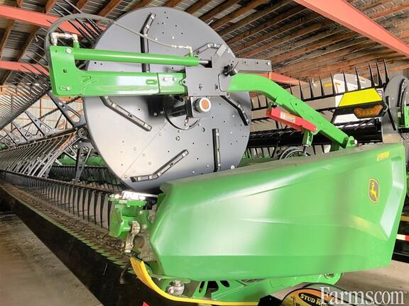 Options: Flip Over Reel, Platform size: 50 Feet, Specifications: Hinged Frame Rigid Cutterbar; Double Knife Drive; Split Reel w/ Fore/Aft & Flip Over Kit; Dual Side Knifes; 18" Upper Cross Auger w/ Retractable Fingers; Header Height Sensing; Wing Leve