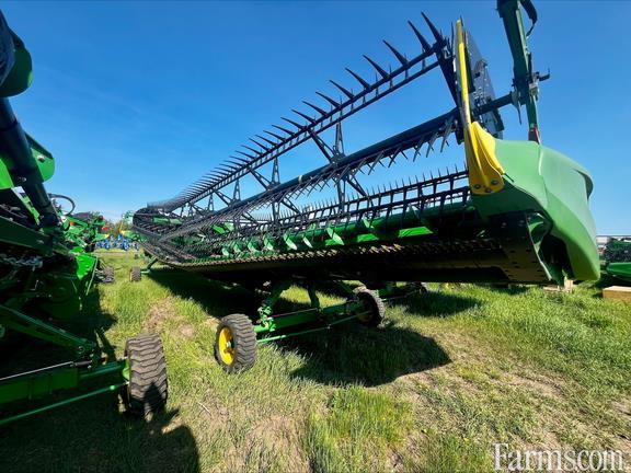 2024 John Deere HD45R with: Flip Over Reel, High wear skid shoes, Fingered top auger, Belt protection system, Fine tooth spare knife, Center section seal kit, Center crop flow divider, And backsheet extensions