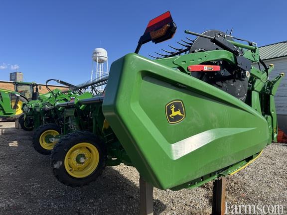 AVAILABLE SPRING, JOHN DEERE HDF 40 HINGED FRAME FLEXIBLE KNIFE DRAPER PLATFORM, 2025, 40' operating width with in cab cutting height control for both ON ground and OFF ground operation, contour master telescopic drive shaft, hydraulic wing leveling, 4-27x10.50-15 ACTIVE rear stabilizer wheels, dual knife drive, 4" double cut coarse tooth knife, extended wear knife guards, FLIP OVER poly tine pickup reel, hyd fore/aft with resume, dial-a-speed reel control, hydraulic reel drive, short poly divider points, 40" wide GRAIN SAVER side draper belts w/speed sensors and belt protection system, center section seal kit, center crop flow divider, poly skid shoes, standard center belt, stubble lights & road transport lights, requires combines with minimum 3.15" (80mm) lift cylinders (3.5", 90mm recommended), also requires HD fore/aft tilt cylinders & lateral tilt cylinders, single point hyd/electrical hookup, 9 pin controller compatible with JD model year 2020+, "S" series combines. Last operated on 2024, S780 combine. JD EXTENDED FULL COMPREHENSIVE WARRANTY UNTIL 06-02-2027 OR 500 HOURS ($250 deductible).