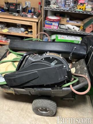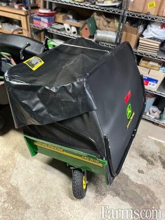 WITH: JD MC519 carted material collection system, 19 bushel capacity, manual dump from the seat, belt driven quick tatch power flow blower, dual caster wheels, easily converts to utility cart.