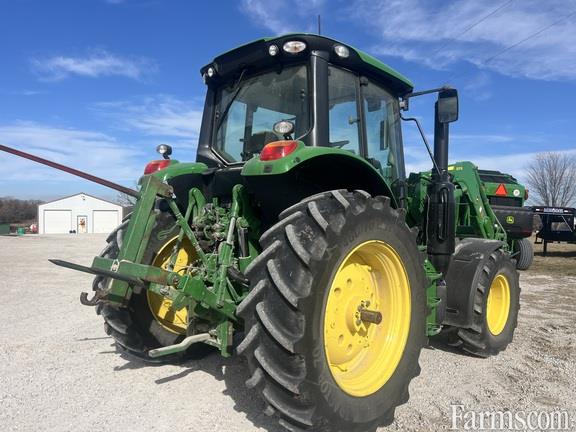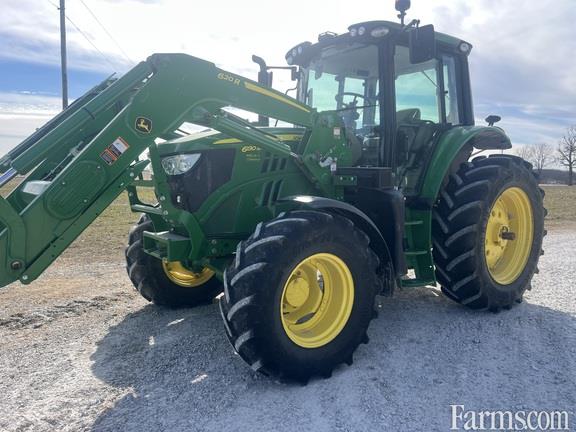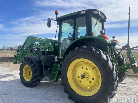 2021 John Deere 6130M tractor with 597 hours. Equipped with cab, MFWD, and 114 L/min hydraulic pump. Features three mechanical rear SCVs, reversible 540/1000 rear PTO, telescoping Category 2 draft links with ball ends, center link with ball end, and sway control blocks. Includes rack-and-pinion rear axle with cast wheels, adjustable steel front wheels, and tire sizes 480/70R38 on the rear and 420/70R24 on the front. Loader-ready with mechanical SCV functions. Additional features include turnable front fenders, toolbox, flat drawbar, cold-start package, economy light package, beacon light, heavy-duty rear wheel brakes, 12V/174 Ah battery with a 170-amp alternator, and front base weight.