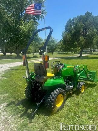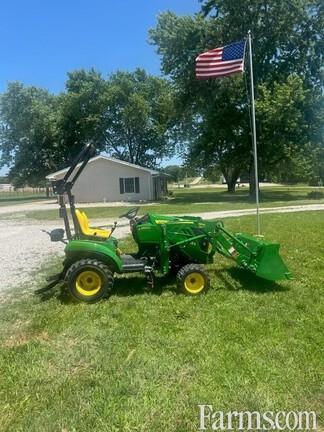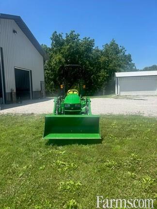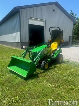 JOHN DEERE 1023E MFWD Compact Tractor WITH LOADER, 2024, 22.4hp, 3 cylinder liquid cooled diesel engine, Open Station with 2 post folding ROPS, dual range twin pedal Foot Controlled E-hydrostatic Transmission, 4 wheel drive plus rear differential lock, 2 function joystick hydraulic controls for loader with mid mount ISO couplers, power steering, Cat 1 limited three point hitch, mid PTO for mower, independent 540 rpm rear PTO, 26x12-12, R-4 (industrial tread rear tires), 18X8.50-10 R-4 front tires. WITH: JD 120E "NON" QUICK TATCH LOADER but has easy remove loader pins and parking stands, JD attachment carrier and 49" quick tatch bucket.