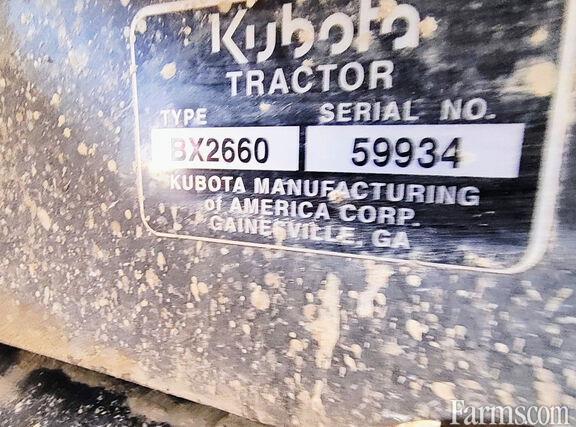 KUBOTA BX2660 MFWD, COMPACT TRACTOR WITH LOADER & MID MOUNT MOWER, 2011, 25.5hp, 3 cylinder, liquid cooled, diesel engine, dual range foot controlled hydrostatic transmission, 4 wheel drive plus rear differential lock, 2 post fixed position ROPS, hydraulic power steering, mid PTO for mower deck, independent 540 rpm rear PTO,