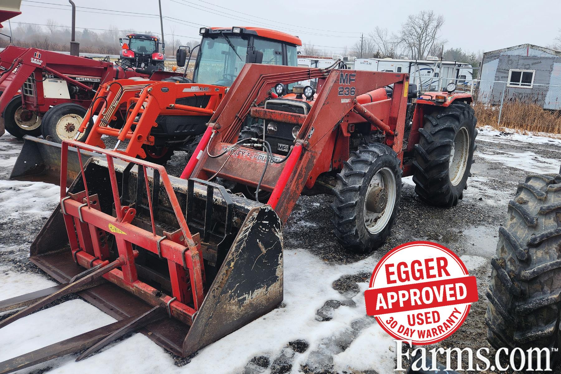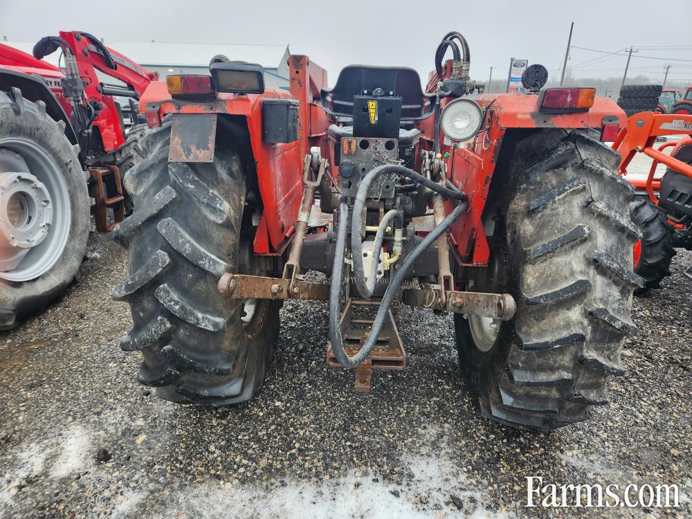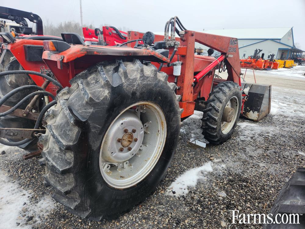 Used 1982-87 MF 274 Tractor with MF 236 Loader, Bucket, Forks, Bale Spear and PTO Hyd Pump for Loader. 74 HP, Diesel, 4WD, 5231 Hrs, 2 sets of remotes, s/n 22112708, tires 90%. In good condition.